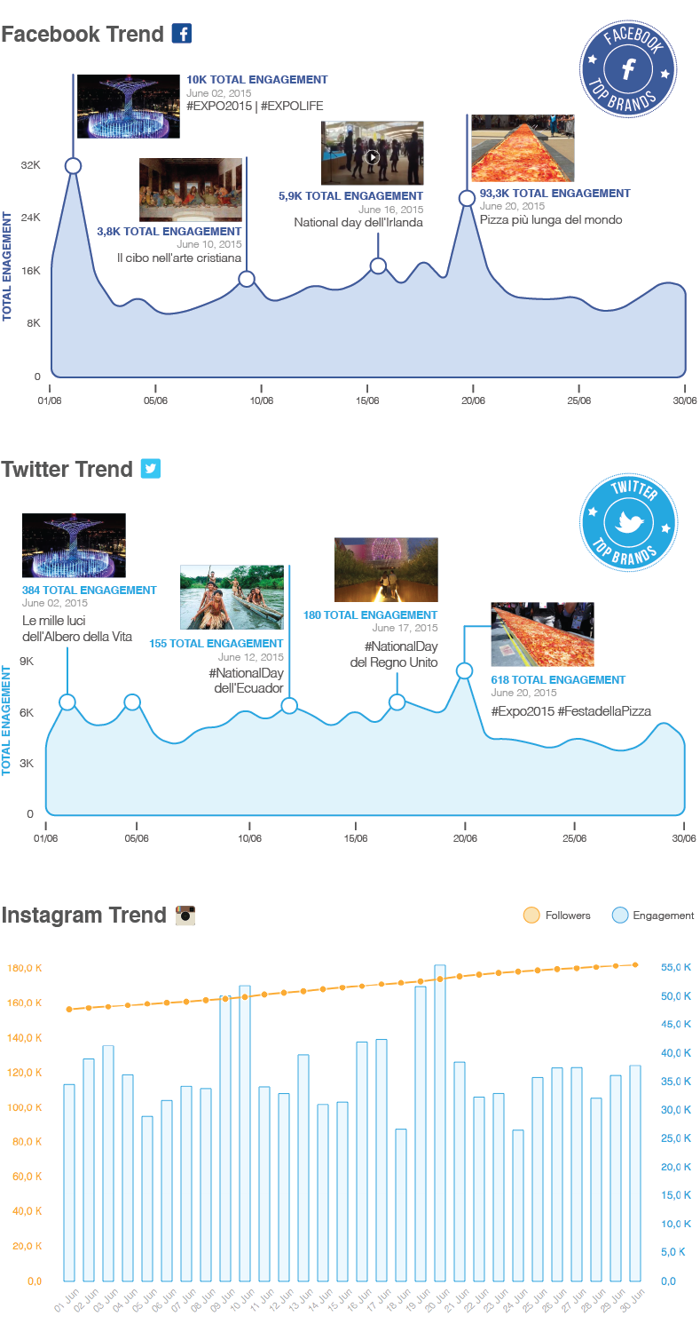 Tra i tre social analizzati, il canale Instagram di Expo 2015 è quello i cui numeri rimangono più stabili: il total engagement infatti si riduce solo di 5,2 punti percentuali mentre i follower continuano a crescere esponenzialmente, +182,2K rispetto a maggio. Il merito di questo successo è la condivisione di scatti altamente suggestivi, la maggior parte dei quali immortalano lo spettacolo dell’Albero della Vita in tutte le sue sfaccettature.
