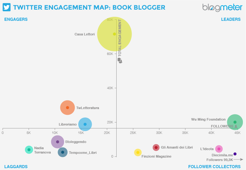 Dei 60 blogger monitorati, ben il 94% di loro è presente su Twitter: la piattaforma di microblogging è infatti un ottimo strumento a loro disposizione per condividere informazioni e link a pagine esterne, blog principalmente. Ne è un esempio Casalettori, leader per engagement con 71K interazioni generate nel periodo di analisi, che pubblica quotidianamente una media di 440 tweet con cui tiene costantemente informati i suoi follower non solo su questioni relative ai libri, ma anche su temi di attualità. Spicca anche il tipo di comunicazione che realizza Wu Ming Foundation che, secondo per numero di follower (ben 44K) dopo Diecimila.me, condivide tweet testuali e visual riguardanti il mondo della politica e società, spesso in chiave critica e sarcastica. È suo, tra l’altro, il tweet che ha ottenuto il più alto numero di interazioni.