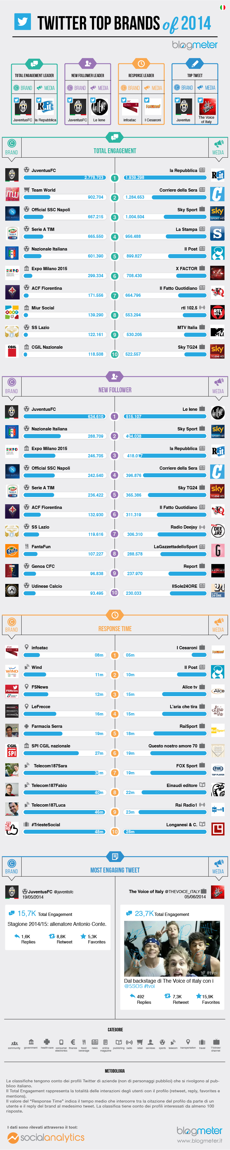 Il Tweet più engaging dell’anno è stato pubblicato da Juventus, con l’annuncio dato via Twitter della conferma a maggio per la stagione 2014-2015 di Conte alla guida dei bianconeri; mentre The Voice of Italy ottiene oltre 23.677 interazioni per il tweet che lancia l’esibizione dei 5 Seconds of Summer come ospiti di una puntata della trasmissione.
