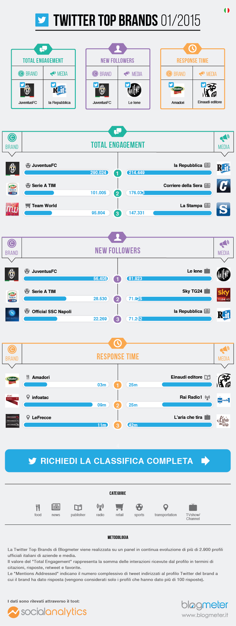 Su Twitter, invece, troviamo una netta predominanza dei profili legati al calcio e al campionato italiano. Le classifiche per engagement e per new fan sono dominate dalla Juventus F.C. Ben 7 dei top 10 account sono comunque legati al mondo del calcio: tra questi anche Serie A Tim (in seconda posizione), e gli account delle principali squadre italiane (Napoli, Lazio, Sampdoria, Fiorentina). Da segnalare nelle prime dieci posizioni due account istituzionali: quello di Expo 2015 e quello di Miur Social. Tra i media le prime tre posizioni per quanto riguarda i profili più coinvolgenti sono occupati da testategiornalistiche: La Repubblica batte il Corriere della Sera nel testa a testa per il profilo più coinvolgente, e al terzo posto troviamo La Stampa. Tra i primi dieci spazio anche alla Tv con AmiciBraccialetti Rossi e Sky Sport.