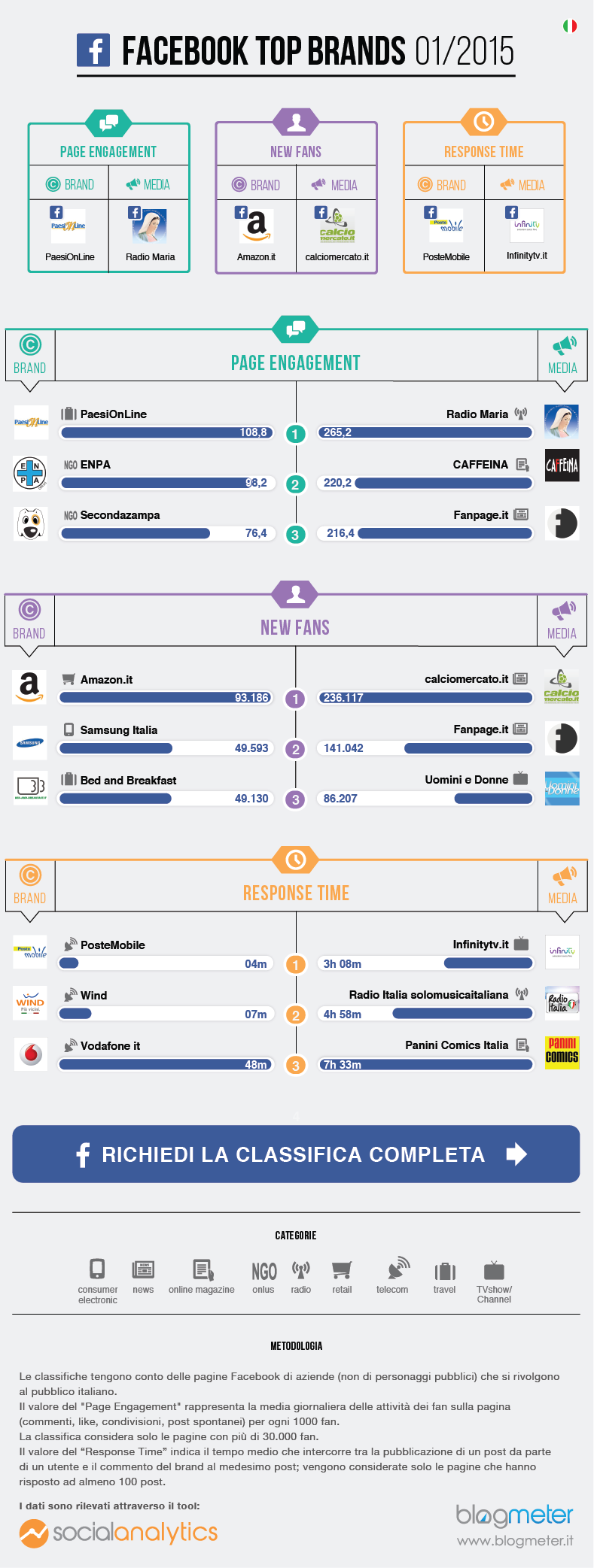 Anno nuovo e immancabile arriva anche la prima Top Brands del 2015 relativa al mese di gennaio di cui nelle infografiche a fondo pagina potete trovare i top 3 player (brand e media) su Facebook e Twitter. Un assaggio della Top Brands completa che dal mese di settembre contiene la classifica dei ben 200 brand e 200 media migliori, analizzati secondo 9 metriche differenti. Un lavoro ricco non solo di dati ma anche di numerosi spunti di riflessione, che speriamo vi faccia venire voglia di saperne di più, come? Abbonandovi al nostro servizio sulle Top 200 mensili.