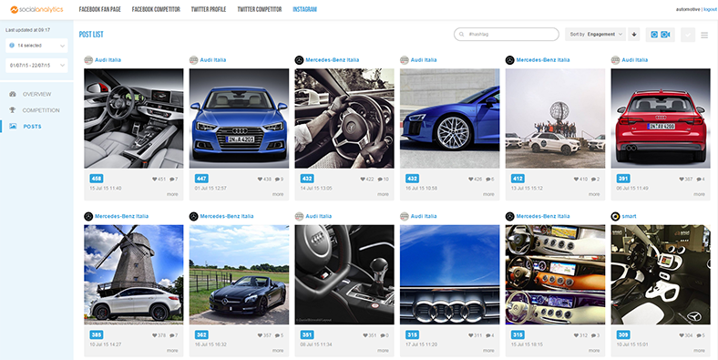È la sezione che mostra i contenuti (foto e video) di maggior successo di uno o più profili, e consente di ordinarli per engagement, like, commenti, data e hashtag. In questo modo è possibile sbirciare le strategie di “content marketing” di altre aziende e prendere spunto per le proprie.