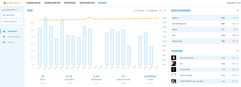 È la sezione che sintetizza le informazioni più importanti su un singolo profilo. L’area trend mostra diversi grafici di confronto tra varie metriche: rapporto follower/engagement, post/engagement, post/like, post/commenti, post/follower. Le altre aree evidenziano gli hashtag che hanno prodotto il maggior engagement, i commentatori più attivi, i contenuti più apprezzati e quelli che hanno funzionato di meno.
