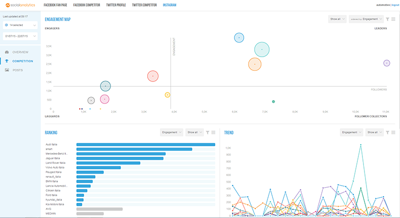È la sezione che permette di comparare le performance del proprio profilo con quelle dei competitor del proprio settore. Una comoda “Engagement Map” mostra il posizionamento dei profili secondo tre metriche: follower, engagement e contenuti pubblicati.