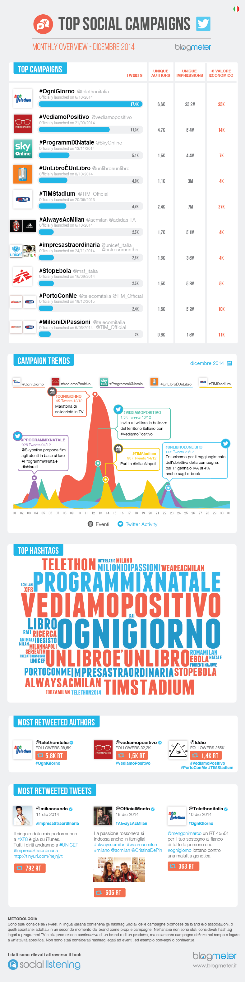 Oltre a @TelethonItalia e @vediamopositivo, che sono stati gli autori più retwittati in assoluto, in terza posizione per viralità dei contenuti pubblicati troviamo niente di meno che @Iddio, che ha deciso di contribuire non a una, ma a ben tre campagne: #VediamoPositivo, #PortoConMe e #TIMStadium. Queste ultime due, sono state entrambe promosse da TelecomItalia e TIM_Official, la prima, new entry, è stata lanciata il 19 dicembre per invitare gli utenti a fare una lista delle cose che avrebbero voluto portare con sé nel 2015, ma è solo il 30 dicembre che le liste hanno iniziato a comporsi, generando un picco di oltre 2,1K tweet in una sola giornata. Tra i tweet più virali ne emergono due legati alle campagne #ImpresaStraordinaria e #AlwaysAcMilan, rispettivamente in 7° e in 6° posizione, con circa 2,5K tweet a testa, con uno scarto minimo tra l’una e l’altra. Il tweet più condiviso in assoluto, con 792 RT, è del cantante Mika, che annuncia l’uscita del suo nuovo singolo i cui diritti andranno all’Unicef, promotore della campagna #ImpresaStraordinaria, che ha come testimonial d’eccezione la prima donna italiana ad essere stata scelta dall’ESA per andare nello spazio: Samantha Cristoforetti.