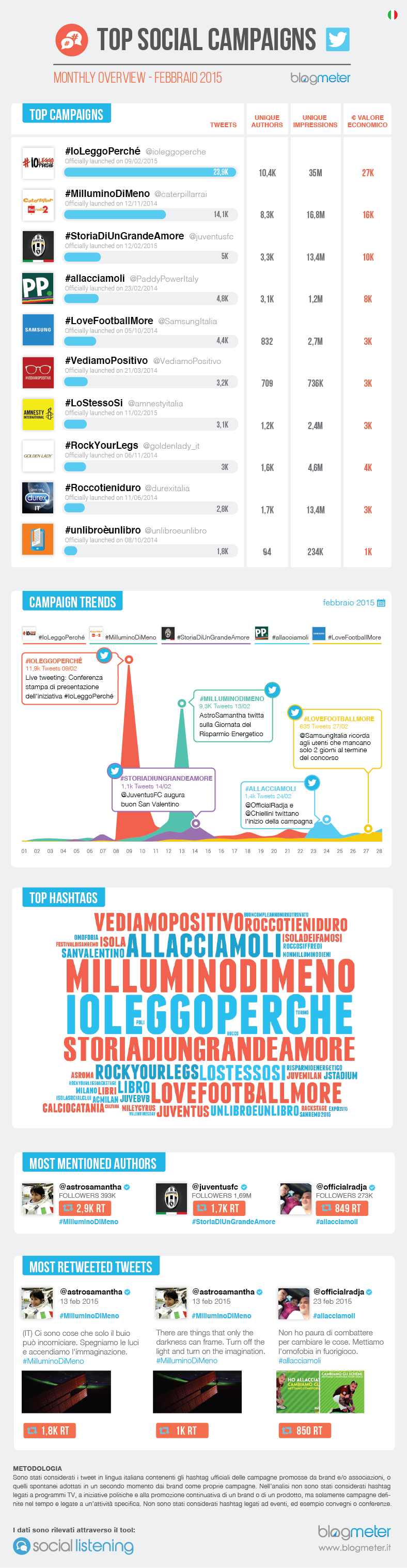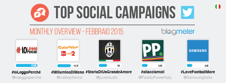Infine, è doveroso menzionare le campagne “sempreverdi“, ovvero quelle già presenti nelle nostre precedenti classifiche, le quali sono la testimonianza che una campagna, se ben pensata, pianificata e monitorata, non conosce limiti di tempo. Ci riferiamo a #VediamoPositivo, prima in classifica lo scorso mese, #RockYourLegs già in classifica a novembre e infine #UnLibroèUnLibro, campagna di grande successo soprattutto negli ultimi mesi del 2014.