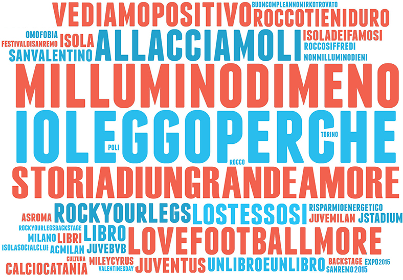 Oltre a #Juventus, sono numerosi gli hashtag relativi al mondo del calcio: #ASRoma, #ACMilan, #JuveMilan. In questo caso, il merito è della campagna #LoveFootballMore di Samsung Italia ideata per promuovere il concorso a premi che ormai da 4 mesi coinvolge i tifosi di Twitter: 4,4K tweet collezionati, che sono stati pubblicati da solo 832 autori unici, dato che testimonia la tenacia e la fiducia degli utenti nel contest e nel brand.