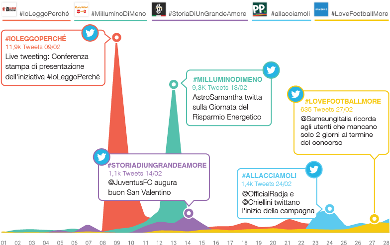 Nel mese dell’amore per eccellenza, non potevano mancare le campagne di San Valentino. Tra quelle che hanno più appassionato gli italiani su Twitter, spicca #StoriaDiUnGrandeAmore lanciata da JuventusFC, che invitava gli utenti a scattare e condividere delle foto che immortalassero la loro passione per la squadra bianconera. Il successo è stato lampante: 5K tweet e 3,2 autori unici; inoltre, l’hashtag #juventus è stato il primo più utilizzato, dopo i primi dieci relativi alle campagne.