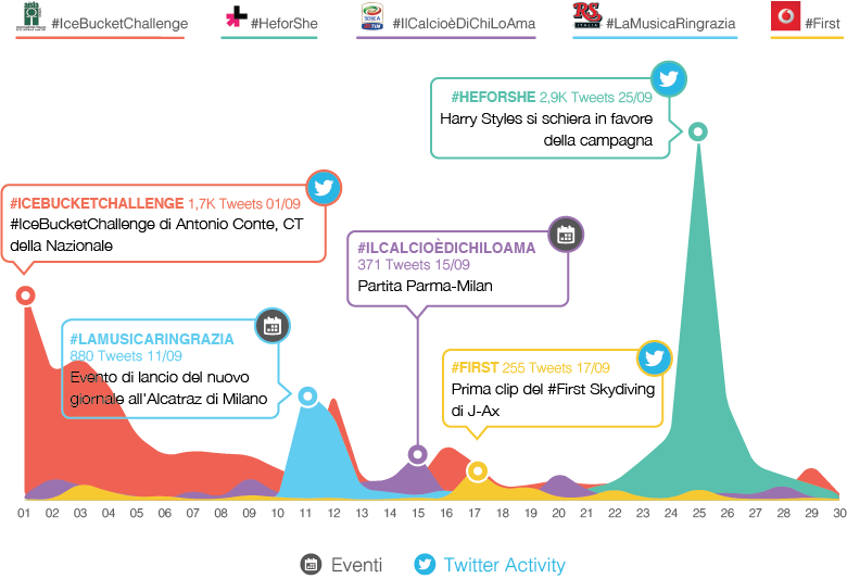 I volumi si sono ridotti rispetto al boom avvenuto durante l’estate, quando la campagna aveva battuto ogni record su Twitter totalizzando oltre 147,2K messaggi, ma nel mese di settembre l’#IceBucketChallenge si conferma la campagna più partecipata e più discussa in assoluto, con 10,8K tweet pubblicati da 8,1K autori unici, che hanno raggiunto circa 34 milioni di unique impressions.
