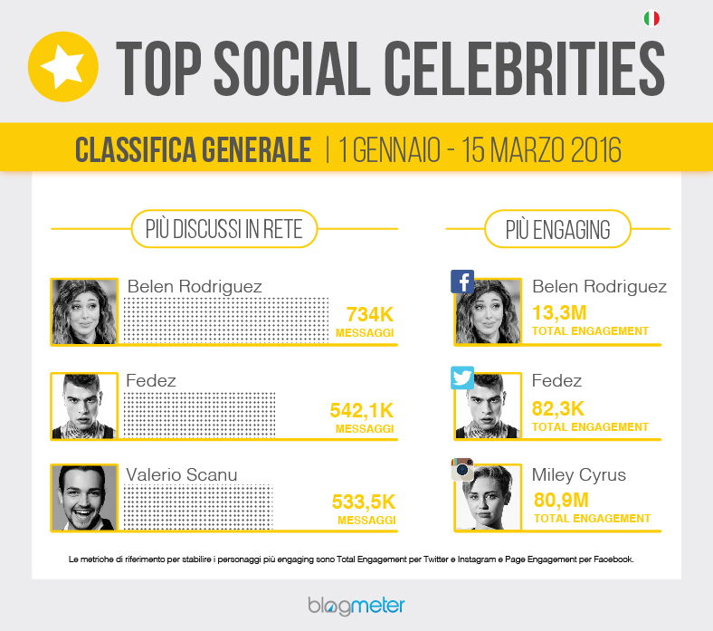 A collezionare il maggior numero di interazioni e di fan/follower sui propri profili social nel periodo considerato è la star internazionale Miley Cyrus, ancora volto di Golden Lady, seguita a distanza da Belen e Fedez.