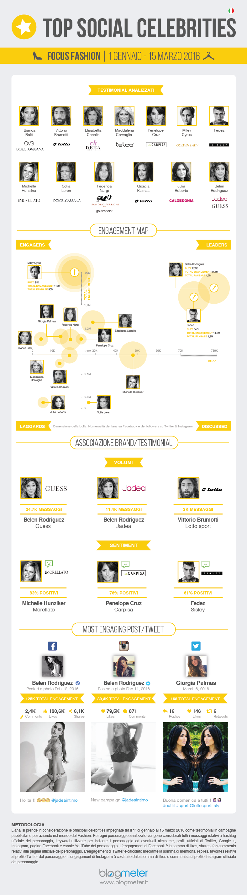 La classifica dei testimonial più discussi in rete si apre con Belen Rodriguez, testimonial di due brand di moda: Jadea, brand di intimo, e Guess per la sua linea Marciano. Segue al secondo posto Fedez, volto di Sisley già dallo scorso anno, che continua a ottenere consensi sul web grazie alla collezione NoGodz, la linea streetwear disegnata dallo stesso rapper milanese.