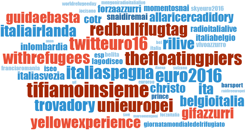 Cjhe i protagonisti di questa edizione di Campaigns siano stai gli Europei, lo dimostra la cloud degli hashtag più utilizzati, nella quale oltre a quelli ufficiali delle campagne monitorate, spiccano quelli dedicati agli europei e alle partite dell’Italia: #Euro2016, #BelgioItalia, #ForzaAzzurri, #ItaliaIrlanda, #ItaliaSvezia e #ItaliaSpagna.
