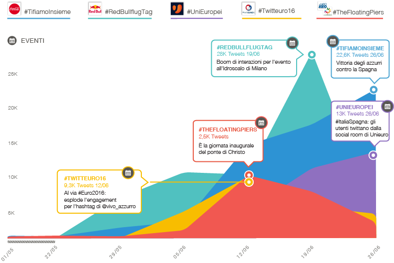 La più coinvolgente tra tutte, che tra l’altro ha conquistato la vetta della nostra classifica bimestrale con oltre 59K interazioni, è #TifiamoInsieme. Si tratta della campagna di comunicazione e marketing che ha celebrato Coca Cola quale Official Partner di Uefa Euro 2016, che ha generato su Twitter oltre 20K messaggi e 8,1K autori unici. Tra gli autori che hanno partecipato attivamente all’iniziativa di Coca Cola, generando un elevato numero di interazioni ci sono anche gli Youtuber iPantellas. Il picco di interazioni dedicati a #TifiamoInsieme si ottiene in occasione della vittoria degli azzurri durante il match contro gli spagnoli.