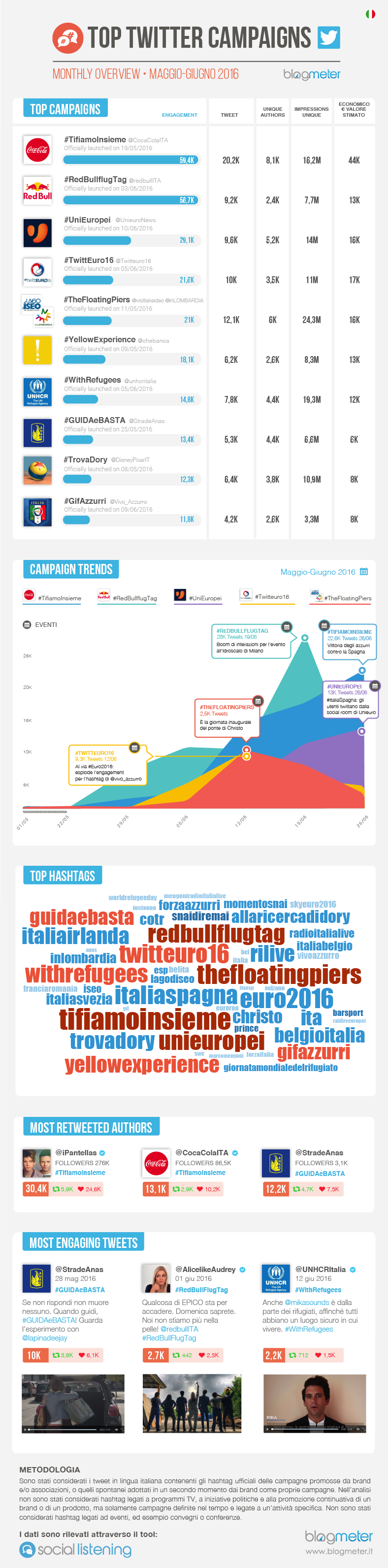 In questa edizione, che ha come periodo di analisi i mesi di maggio e giugno, troverete una novità. Se in precedenza la metrica chiave attraverso cui erano stilate le top 10 era il numero di citazioni generato da ciascuna campagna su Twitter, a partire da questa edizione classificheremo le campagne hashtag in base alla capacità di coinvolgimento, ovvero considerando il numero di interazioni totali generato da ognuna.