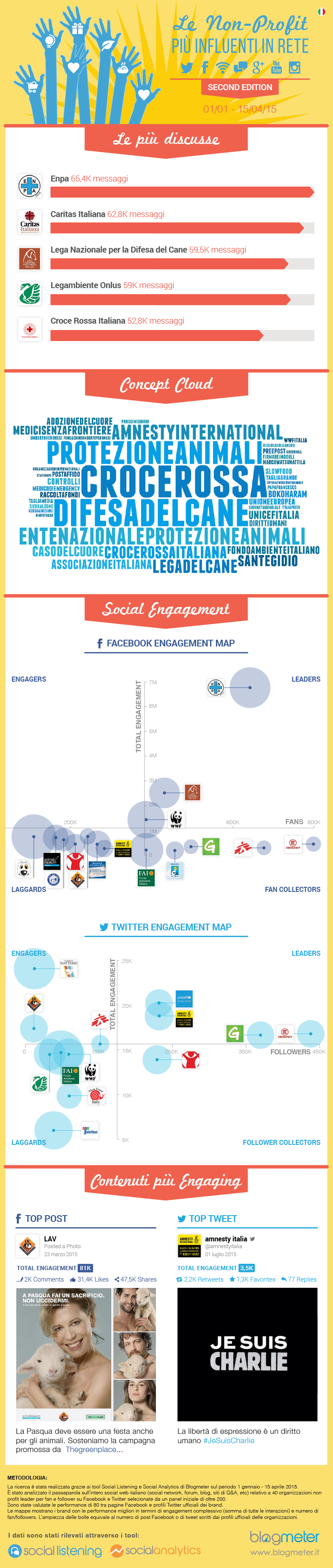 La ricerca, realizzata attraverso gli strumenti di Social Listening e Social Analytics sul periodo 1 gennaio – 15 aprile 2015, ha quattro sezioni principali: una dedicata alla presenza online di 40 organizzazioni non profit, una alle performance dei loro profili social ufficiali, una terza alle campagne hashtag di maggior successo lanciate dalle associazioni nel periodo in analisi e una quarta legata ai testimonial del settore non profit.