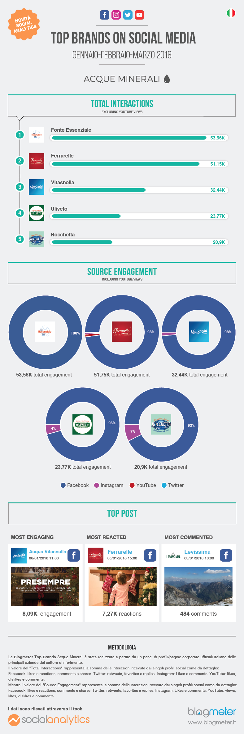 Questo mese sono state analizzate le performance di tutte le pagine ufficiali Facebook, Twitter, Instagram e YouTube dei principali brand di Acque Minerali presenti sul mercato italiano e che si rivolgono esclusivamente allo stesso. Di 32 brand presi in esame è stata creata una classifica in cui sono stati evidenziati i 5 brand risultati migliori per interazioni totali (escludendo le views di YouTube) nel trimestre dall’1 gennaio al 31 marzo 2018.