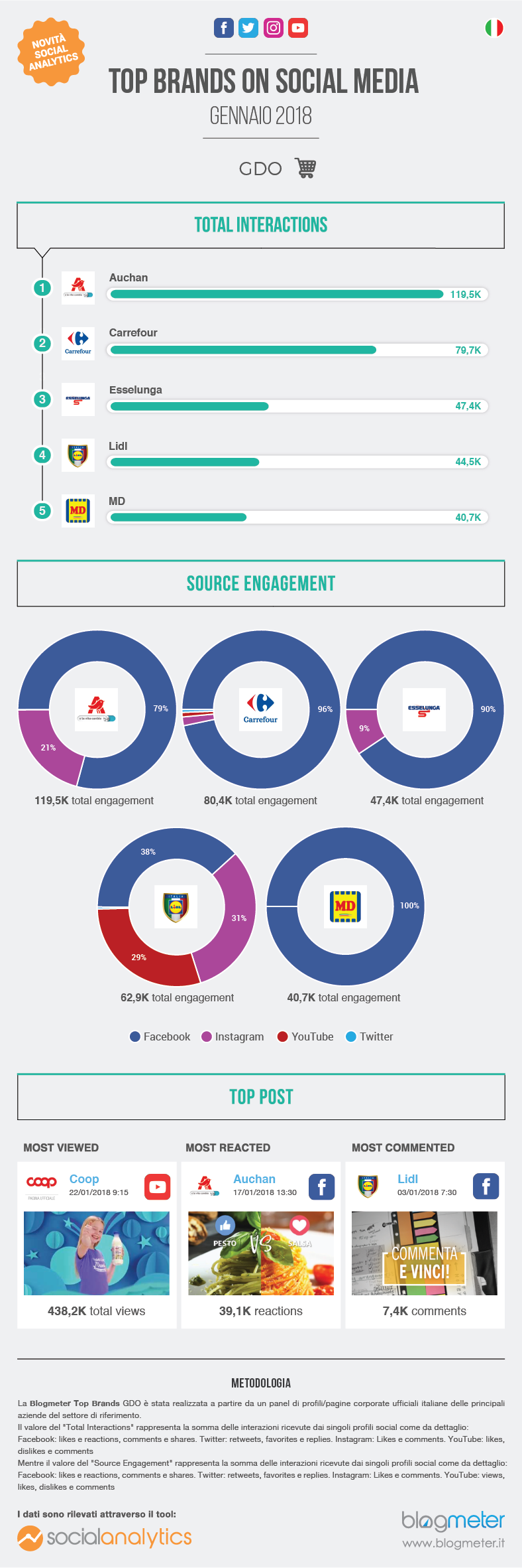 Questo mese abbiamo analizzato le performance di tutte le pagine ufficiali Facebook, Twitter, Instagram e YouTube dei principali brand GDO, comprendenti un panel di 19 aziende, che si rivolgono esclusivamente al mercato italiano. La classifica prende in considerazione la metrica del total engagement relativa al mese di gennaio 2018.
