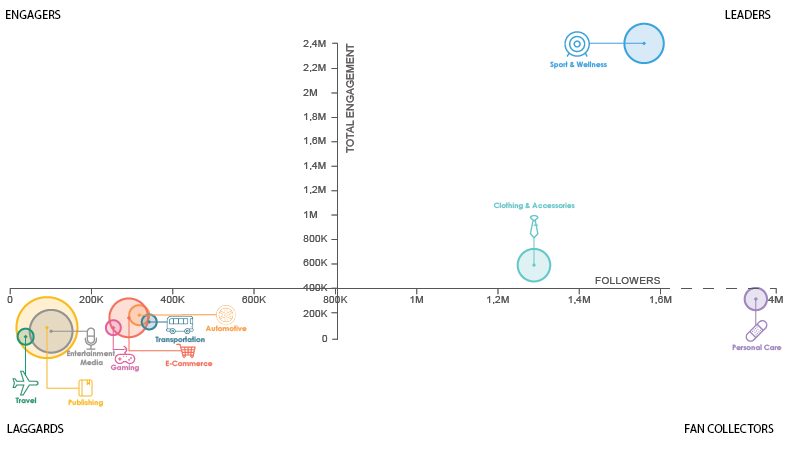In termini di follower-base, invece, è il mondo del beauty & personal care a trionfare (3,8 milioni di seguaci); secondo e terzo posto per lo sport e il fashion (rispettivamente 1,6 e 1,3 milioni).